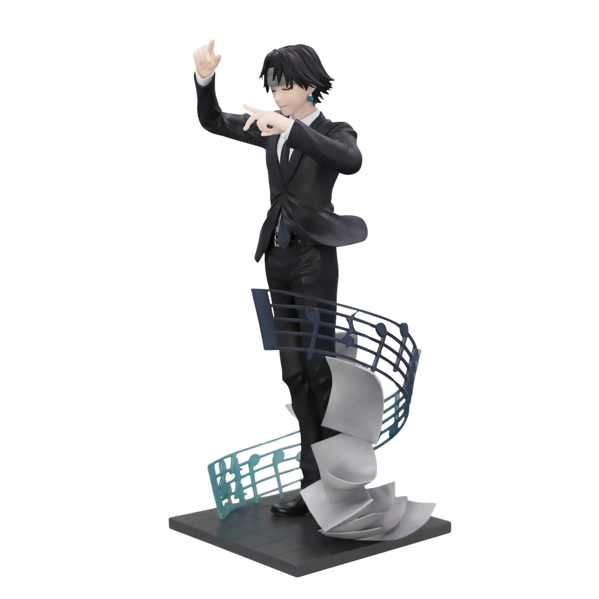 • Produit : Figurine statique de Chrollo Lucilfer en costume noir, bras levés dans une pose de chef d’orchestre avec partitions flottantes