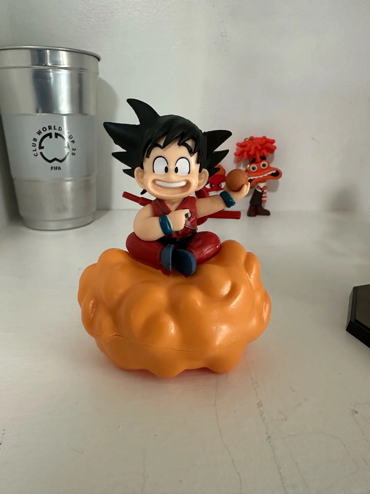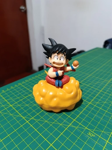 Les détails finement sculptés mettent en valeur la posture dynamique de Goku, son sourire énergique, ainsi que les nuages ondulants qui entourent son fidèle Nuage Magique. L’expression de Goku incarne son caractère audacieux et toujours enthousiaste, tandis que les couleurs vives du nuage apportent une touche de magie supplémentaire.
