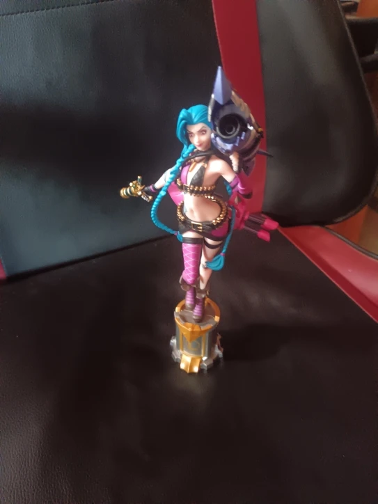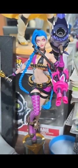 Cheveux bleus en couettes, collants filet, arsenal loufoque et sourire ravageur : cette figurine de 22cm capture l’énergie incontrôlable de Jinx à la perfection.