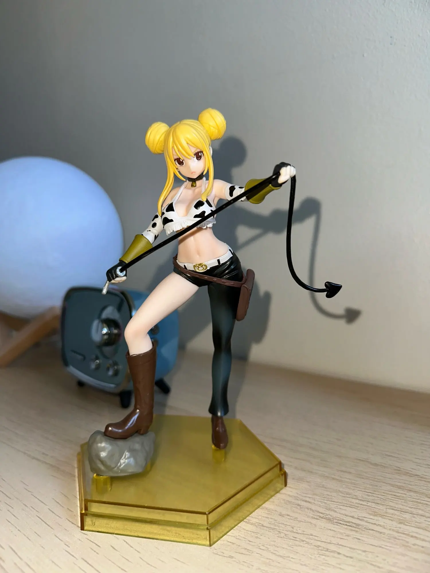 Cette figurine exclusive représente une personnage blonde au style cowgirl sexy, armée d’un fouet et vêtue d’un costume asymétrique en cuir et imprimé vache. Posée fièrement sur un socle translucide jaune, elle dégage une forte personnalité et attire tous les regards.